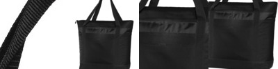 Let the party begin! With room for 24 cans and more, this large cooler features an adjustable web carrying strap and shoulder pad for easy transport. 420 denier honeycomb polyester, 600 denier polyester canvas Heat-sealed, water-resistant lining Interior zippered mesh pocket for utensils Two large side mesh elastic-trimmed pockets Removable, reinforced bottom Large front slip pocket for easy decoration access Dimensions: 12.25'h x 14'w x 8'd; Approx. 1,372 cubic inches Note: Bags not intended for use by children 12 and under.