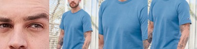 5.4 oz., 100% cotton; No two patterns are exactly alike; Double-needle white stitching throughout; Seamless rib at neck; Shoulder-to shoulder tape; Wash separately;